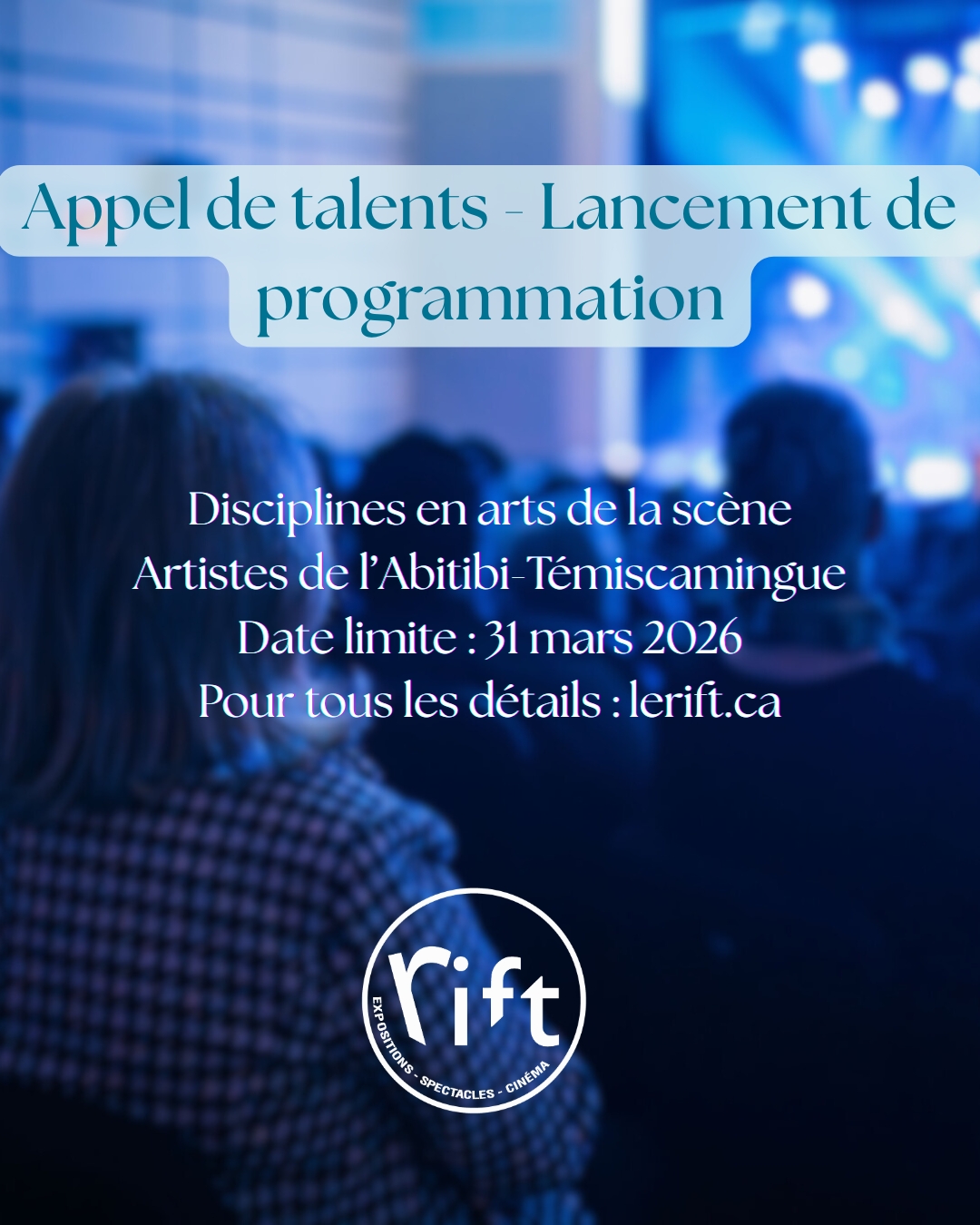 LE RIFT LANCE UN APPEL DE TALENTS DANS LE CADRE DE SON LANCEMENT DE PROGRAMMATION D’AUTOMNE 2026. CET APPEL S’ADRESSE AUX ARTISTES PROFESSIONNELS ET ÉMERGENTS DE L’ABITIBI-TÉMISCAMINGUE QUI SOUHAITENT PRÉSENTER UN SPECTACLE EN MUSIQUE, THÉÂTRE, DANSE, HUMOUR, cirque OU TOUTE AUTRE DISCIPLINE LIÉE AUX ARTS DE LA SCÈNE.