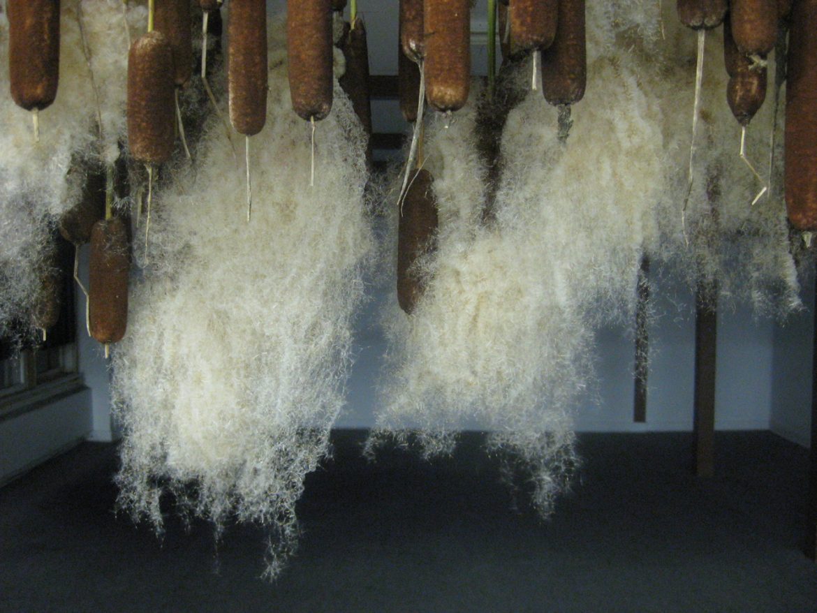 Pendant sa période de résidence, l’artiste réalisera une action de cueillette de quenouilles, qui seront par la suite accrochées, tête en bas, dans la salle d’exposition. Au fil du temps qui passe, les épis ouvriront pour laisser tomber le duvet qui les caractérise. Cette longue performance questionne le rapport au temps, tout en abordant la présence de plantes envahissantes qui mettent en péril nos espèces indigènes.