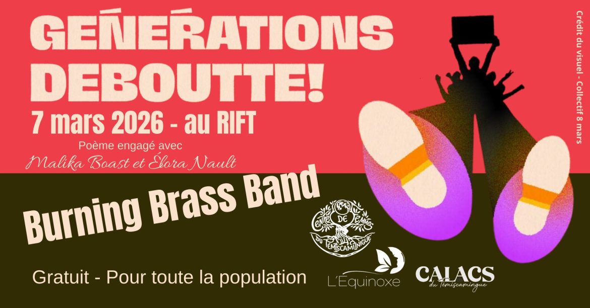 Sous le thème Générations deboutte!, le Centre de femmes du Témiscamingue, en collaboration avec l’Équinoxe et le CALACS du Témiscamingue, invite la population à une soirée festive et solidaire dans le cadre de la Journée internationale des droits des femmes.